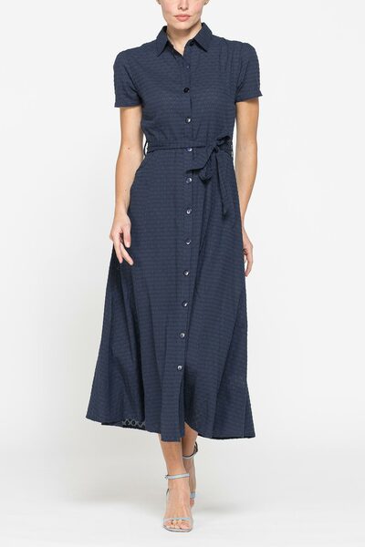 Abito lungo realizzato in voile di cotone leggero, ideale per le giornate estive. Le maniche corte presentano una leggera arricciatura sulla spalla. Il collo è classico, mentre l’abbottonatura lungo il davanti aggiunge un dettaglio elegante. La cintura annodabile in vita, realizzata nello stesso tessuto, permette di definire la silhouette. Dotato di tasche laterali e una gonna leggermente svasata