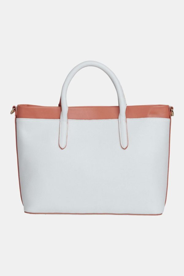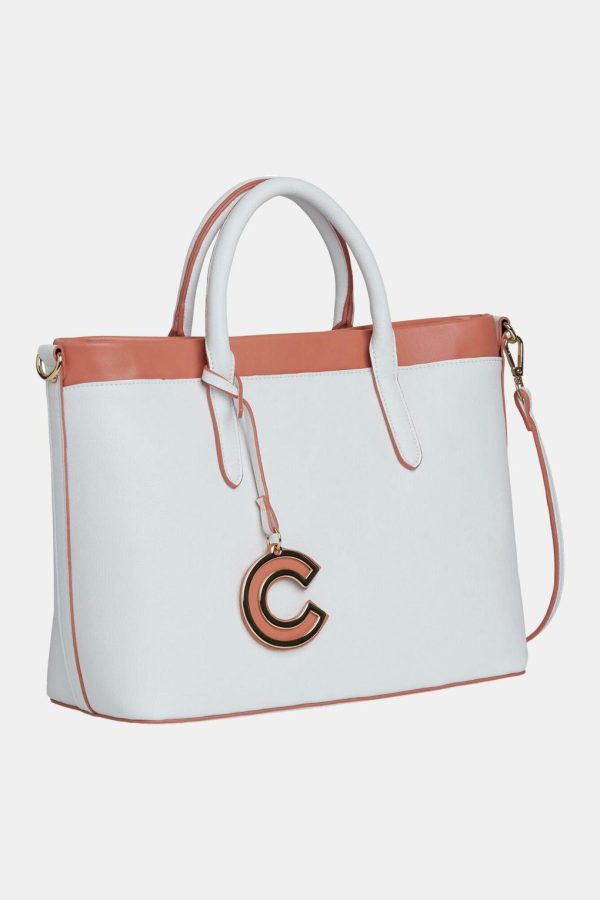 Questa borsa in ecopelle unisce stile e praticità grazie al design bicolor avorio e corallo. Il maxi charm “C” aggiunge un tocco originale, mentre i manici e la tracolla regolabile la rendono comoda da portare ogni giorno. Perfetta per dare colore e carattere ai tuoi look. Dimensioni 37x26x15