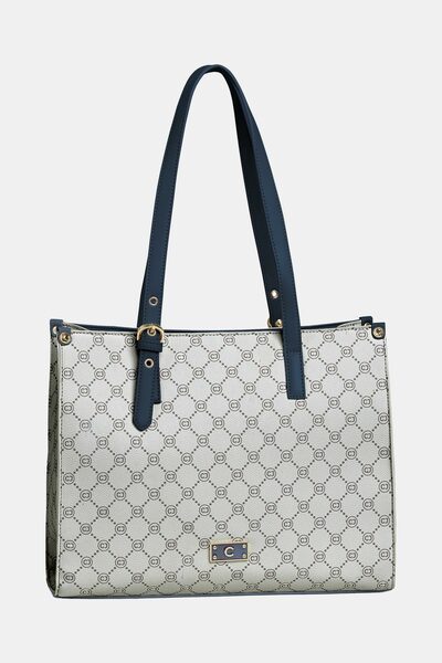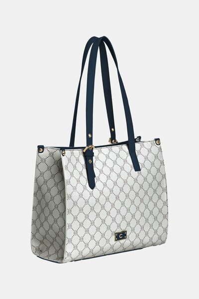 Questa borsa a mano dallo stile sofisticato è realizzata in ecopelle color avorio con un elegante motivo monogramma “C” in rilievo. Dotata di manici doppi e tracolla regolabile e rimovibile, offre versatilità e comfort. I dettagli in metallo dorato e la placca frontale con logo aggiungono un tocco di classe, rendendola perfetta per ogni occasione, dal lavoro all’aperitivo. Dimensioni 34x29x10