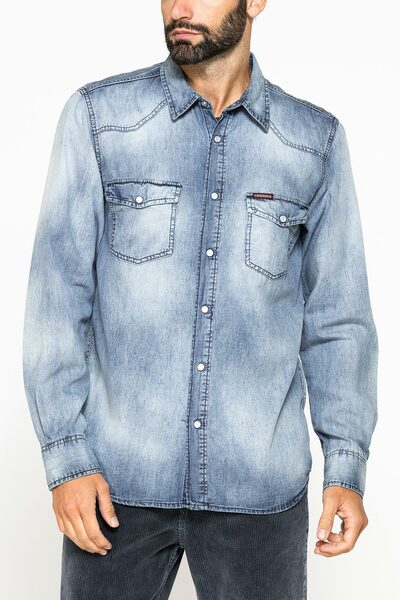 Camicia a manica lunga realizzata in leggero denim da 7 once, in puro cotone. Il modello è caratterizzato da un doppio taschino con pattina e bottoni, mentre la chiusura è impreziosita da bottoni a pressione effetto madreperla. Il lavaggio con trattamento dona al tessuto un aspetto autentico e vissuto, rendendo questo capo perfetto per un look casual e versatile.