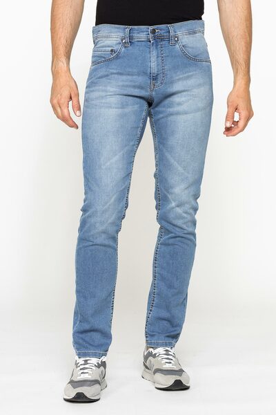 Jeans modello 5 tasche da uomo con vestibilità aderente. Il tessuto dei modelli Relax parla di jeans esternamente e di comoda felpa all’interno, realizzato in denim Play da 10 once dona una sensazione di Extra Comfort. Questo pantalone presenta una tasca porta smartphone, passanti in cintura, chiusura centrale con bottone e zip, etichetta sul retro cintura in jacron, bottone e rivetti personalizzati Carrera. Realizzato in diversi lavaggi con trattamento effetto usura.
