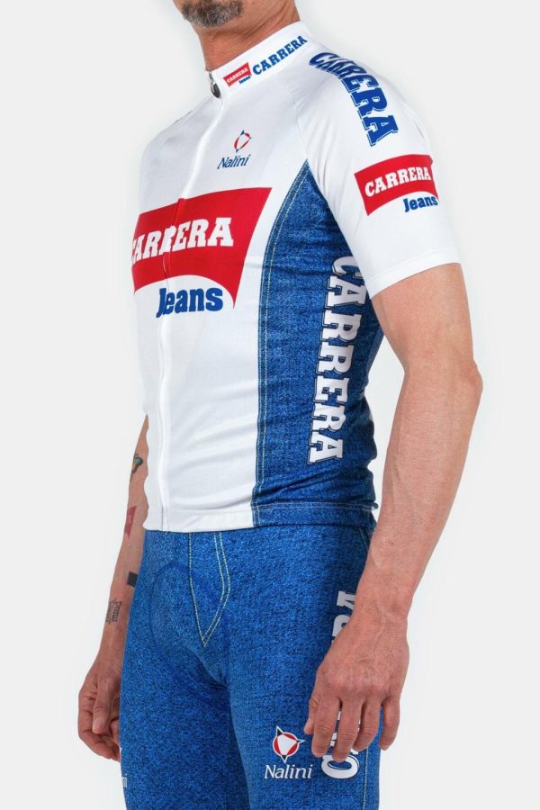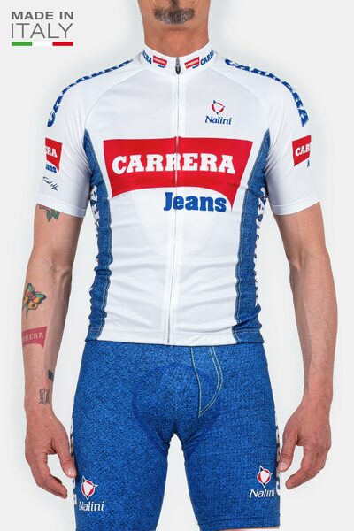 Maglietta da ciclismo a manica corta con cerniera zip. Realizzata in tessuto tecnico, utilizzata anche a livello professionistico. Il materiale è leggero e traspirante, realizzato in Italia, per un massimo comfort. Le grafiche si ispirano al team Carrera degli anni ’80 e ’90.