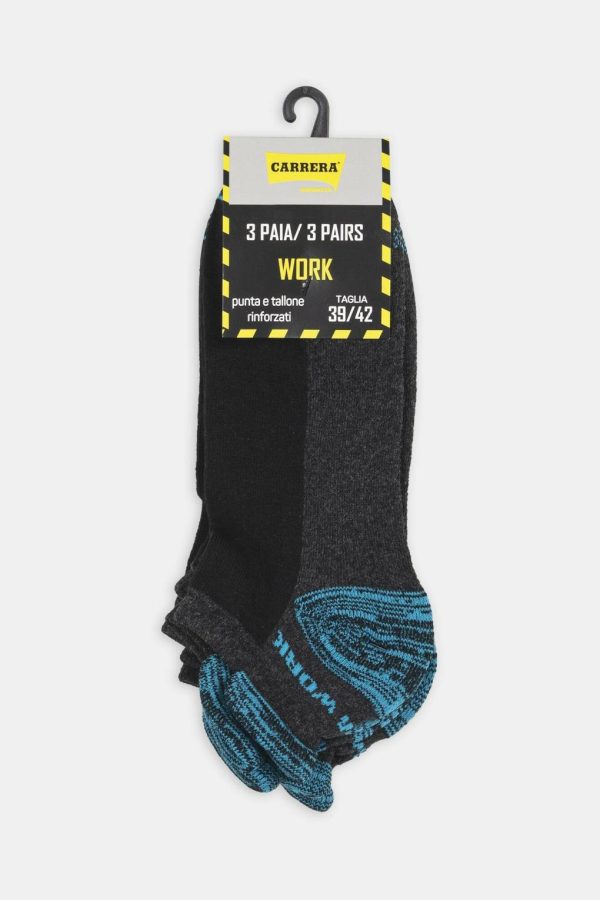Confezione da 3 paia di calze corte da lavoro modello sneakers. Massima traspirabilità, tallone e punta con rinforzo per un miglior comfort e resistenza.