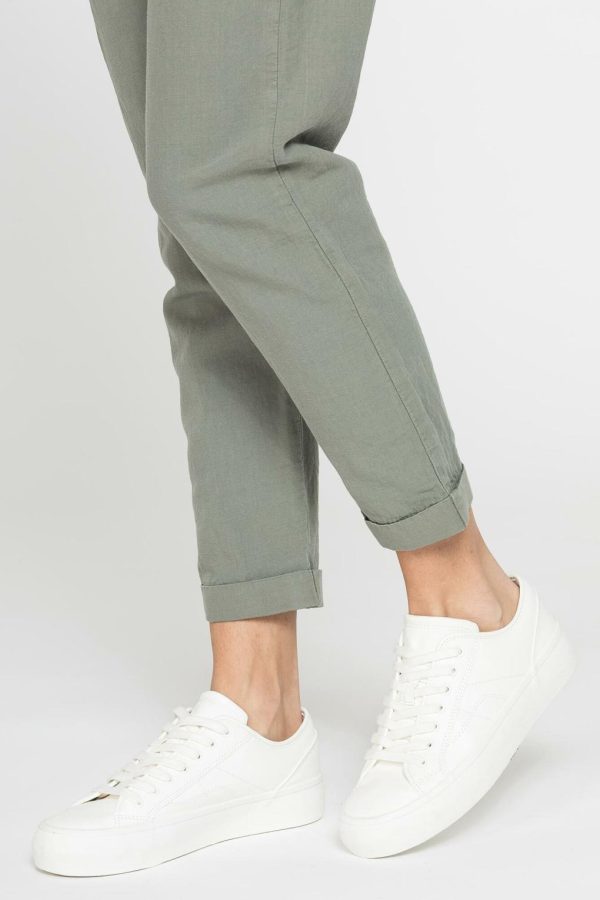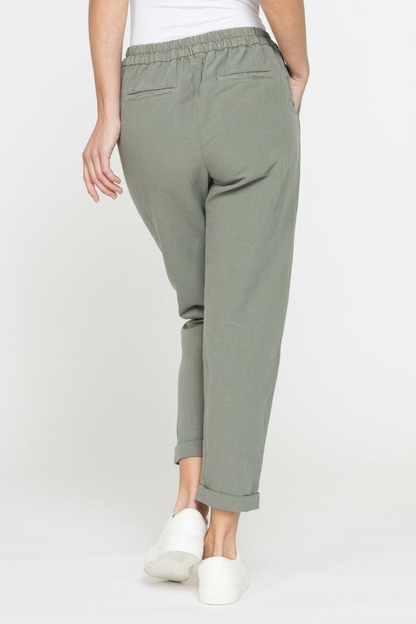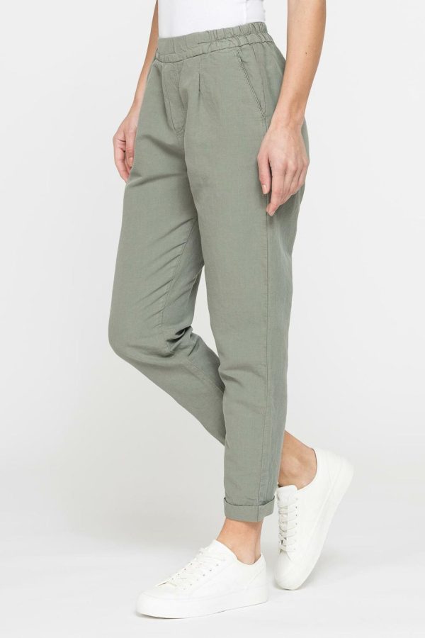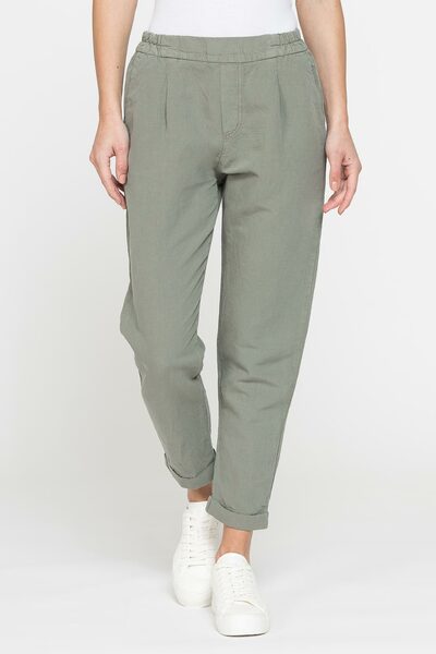 Pantaloni cropped in misto lino, gamba morbida con dettaglio piega sul fondo. Tasche frontali ed elastico interno sul retro. Confortevoli e quotidiani, dal taglio aggiornato.