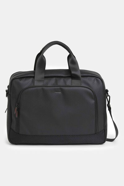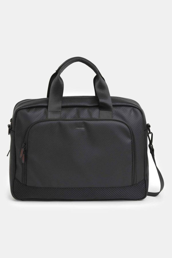 Briefcase da uomo nera con personalizzazioni Carrera e dettagli zip rossi. Tracolla regolabile e sganciabile con comodo moschettone. Dimensioni: 40 x 28 x 15 cm.